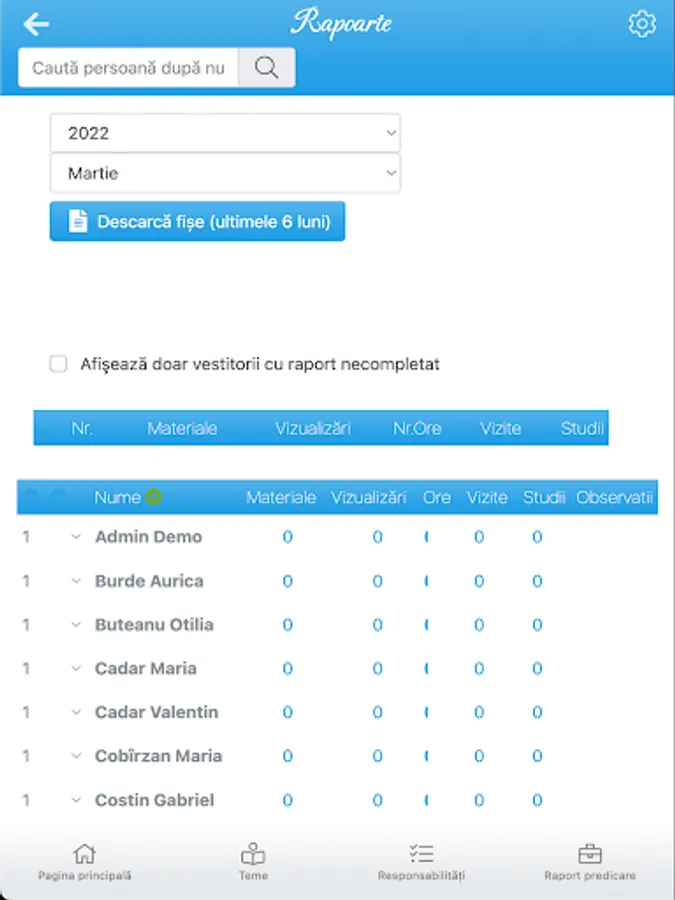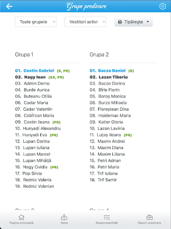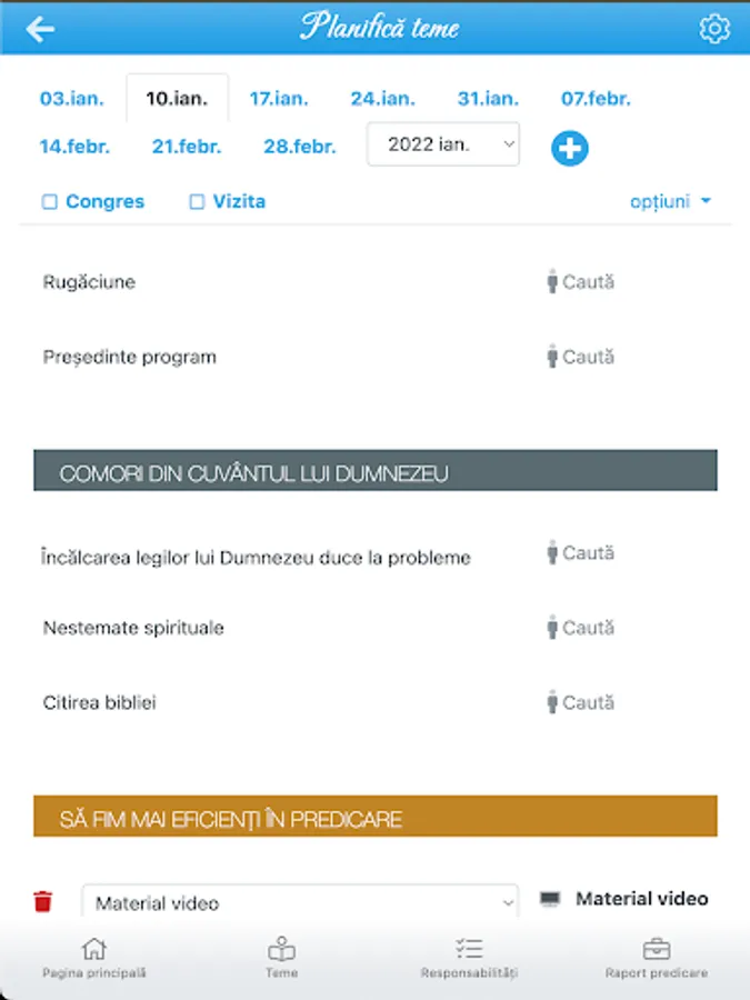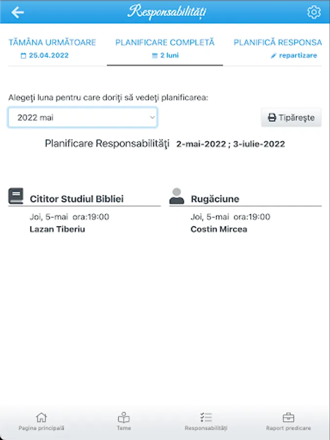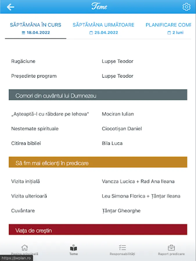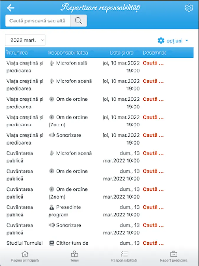 The application facilitates planning various responsibilities in the congregation of Jehovah's Witnesses, such as themes, readers, president, sound system, microphones, orders and more. It must first add / update the list of publishers and tasks you can perform, then the application will suggest heralds for each task. Heralds were assigned most recently will be the first in the list of suggestions.