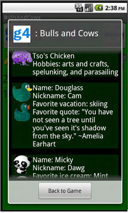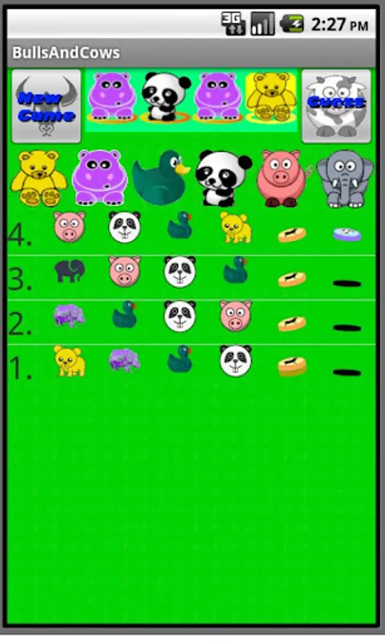 G4: Bulls and Cows is a logic puzzle game where the objective is to discover the sequence of four animals. Each of the six possible animals may appear once, more than once, or not at all. You are given clues about your guess to help you solve the puzzle. Clues are either Bull coins if you have the correct animal in the correct place or Cow coins for each correct animal that is in the solution but not in the place where you guessed.