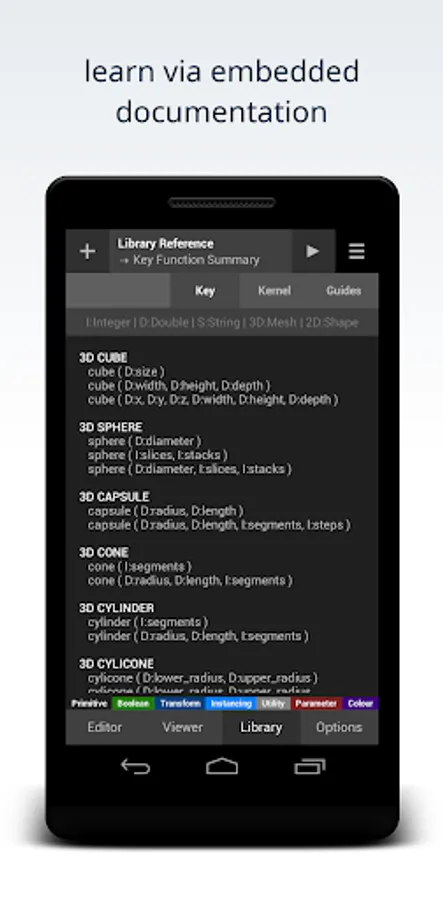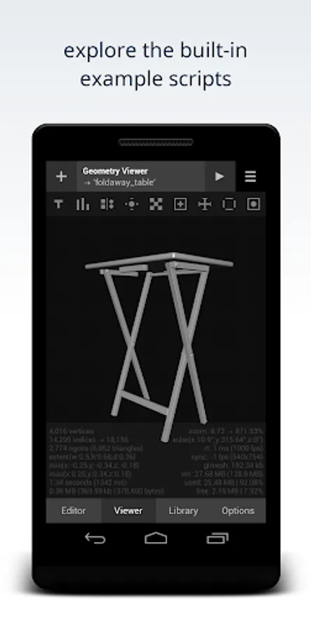 Note: this app requires permission to read and write device storage in order to open, run and save scripts and export 3D mesh. On newer Android devices this permission is no longer granted automatically upon install and must be explicitly granted by a user either via an in-app request or through app settings. If this application fails to open, run or save scripts - it is because the storage permission has not been granted. To fix this - head to app-settings and enable storage access for this app. After granting the storage permission restart the application (i.e. close it and then relaunch it) in order to ensure that the permission change takes effect.