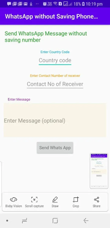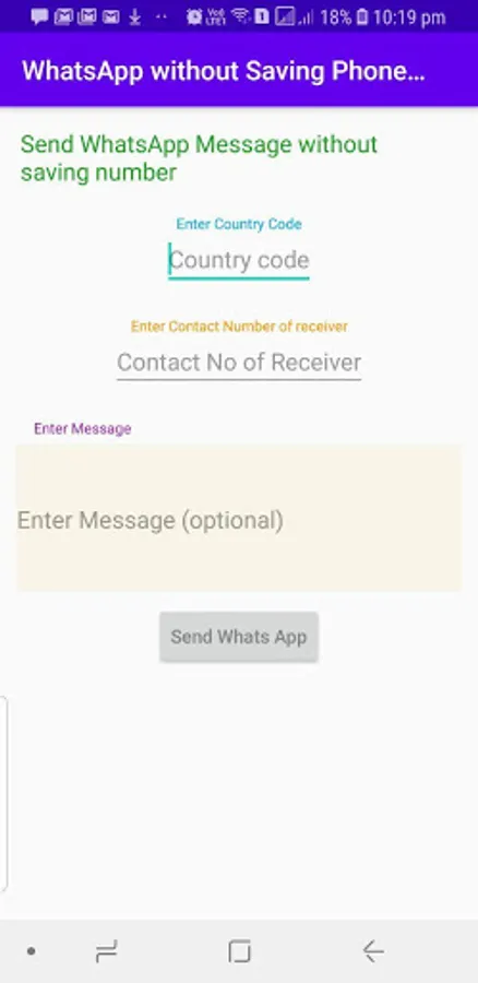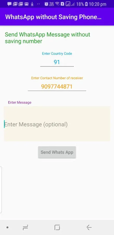 Some times you do not want to save a contact number as it is of one time use only but want to send whats app to that number, here our app will help as With the help of this app you can send whats app without saving Contact Number.