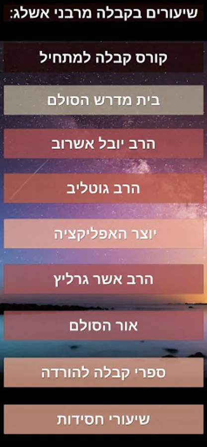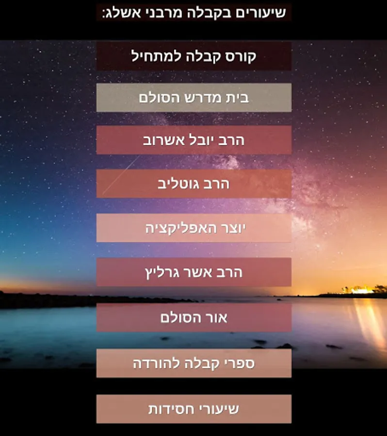האפליקציה מרכזת את מיטב רבני אשלג שמלמדים את תורת הקבלה ברוח היהדות וקרוב למקור. הרב גוטליב, הרב אשרוב, הרב סיני, הרב גרליץ ועוד. יוצר האפליקציה רוצה לאפשר לכולם לטעום מחכמת הקבלה בצורה נכונה על כן ריכז את מיטב הרבנים במקום אחד וכל אחד יתחבר למה שנפשו חפצה.