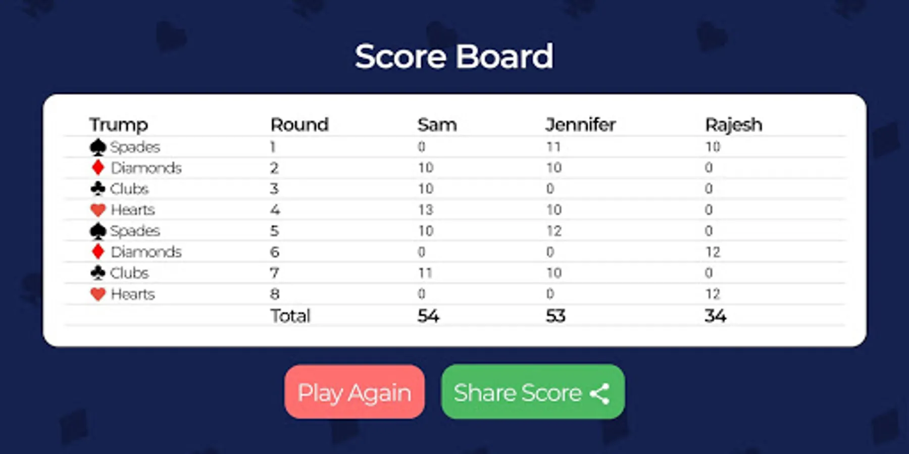 If a player estimated 3 and wins exactly 3 hands, player gets 13 or 30 points depending on settings set by Room Admin