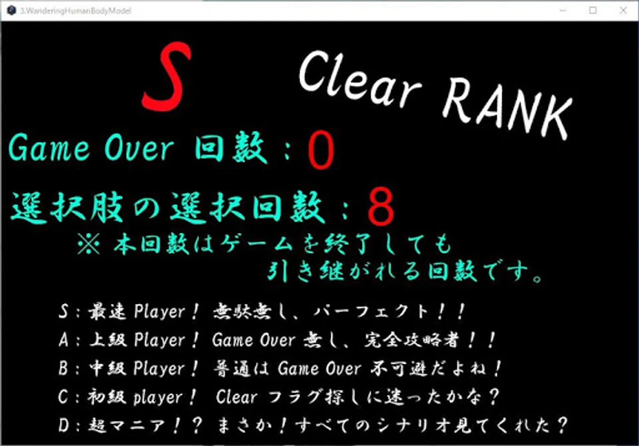 クリア後に選択肢の選択回数とGameOver回数、クリアランクが表示されます。