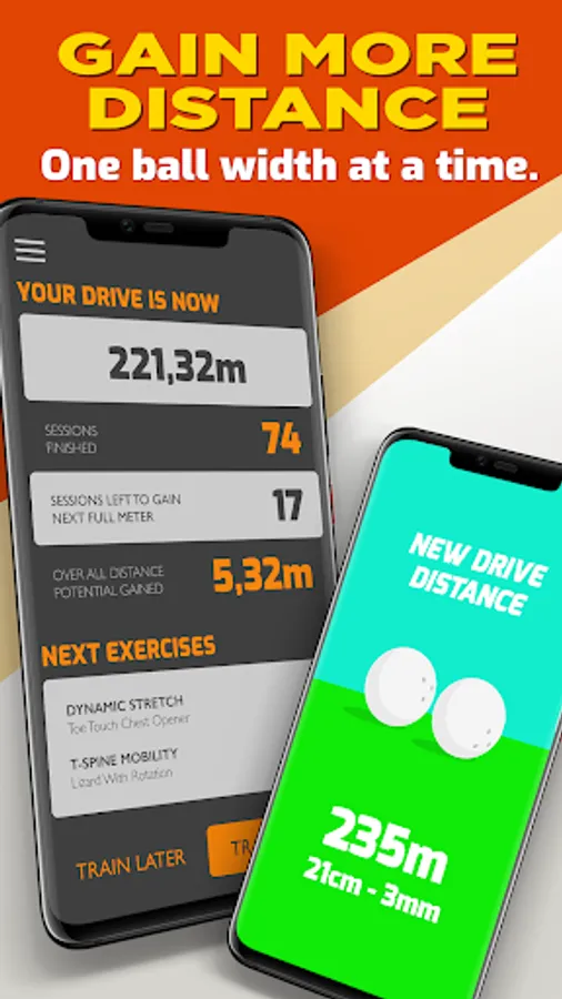 Longer golf drive every day -app guides you to two simple and easy daily golf fitness exercises which will make your drive longer and longer. One ball width at a time. You can also train more than once a day to gain even more distance, but remember to be careful and stop training if any movement causes pain. All training is done at your own risk.