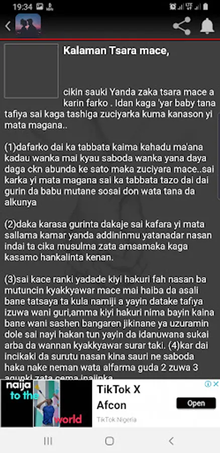 Nakan raba dare ina mai roqon Allah don neman biyan buqata, ko kinsan kece abu na farko da nike roqo samu! Yanayin sanyi kan sa mutum ya takura, tare da lullu6a da qaton mayafi amma ni duk sanyin da ake idan na tunaki sai naji tamkar yanayin zafi! Kamar yadda kowacce bishiya kanyi rassa a sama, kuma tayi saiwa a qasa, haka sonki ya mamaye dukkan jikina, idan na kalleki sai nayi farin ciki, idan naji tattausan muryarki, sai nishadi da walwala tare da annashuwa gami da farin ciki su mamaye zuciyata Abokina ahakan zaka bi don sace zuciyar masoyiyarka cikin sauki!! Kema zaki iya juya turn na wannan kalaman domin sace zuciyar masoyinki cikin sauki!! In kuma kinyi musu ku jaraba kugani!!