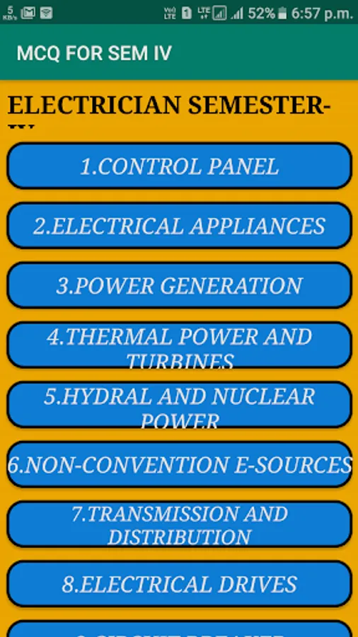 ELECTRICIAN MCQ FOR SEMESTER-II APP IS VERY USEFUL FOR ITI ELECTRICIAN TRADE. THE MCQs ARE COLLECTED FROM VARIOUS SOURCES FROM INTERNET. NOW DAYS, ONLINE EXAMS WITH MCQs ARE VERY USEFUL IN PREPARATION FOR COMPETITIVE EXAMS (LIKE-RAILWAY, WBSEDCL, WBSETCL, BHEL, SAIL, ETC. & ELECTRICAL CORE INDUSTRY ALSO).