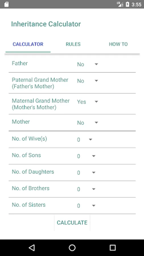 2. This section of Islamic inheritance Calculator App describes what are the rules and laws of inheritance in Islam and what will be the shares of relatives like Father, Mother, Husband, Wife, Son, Daughter, Brother, Sister,...etc in the absence or presence afore-mentioned relatives.