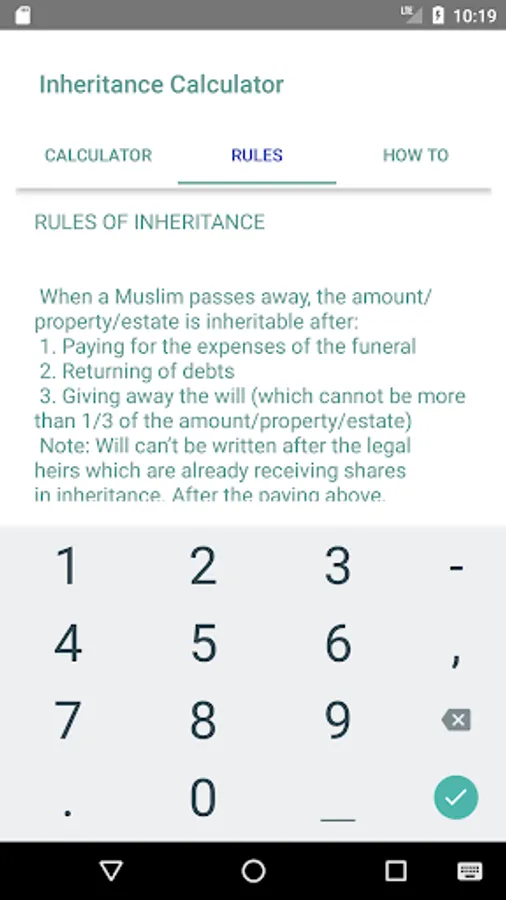 With this app, you can calculate Islamic inheritance, as per inheritance law in islam. This inheritance calculator can calculate the share(s) of close relatives like Father, Mother, Husband / Wife, Son, Daughter, Brother and Sisters according to Inheritance law in Islam.