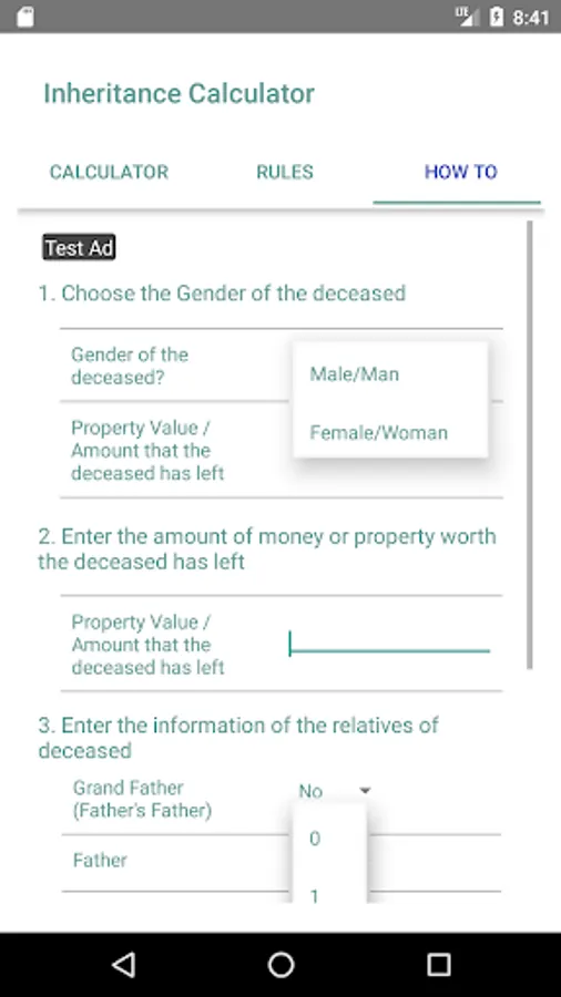 1. The "how to use" section describes what needs to be entered in the Islamic calculator to find the inheritance shares of the relatives.