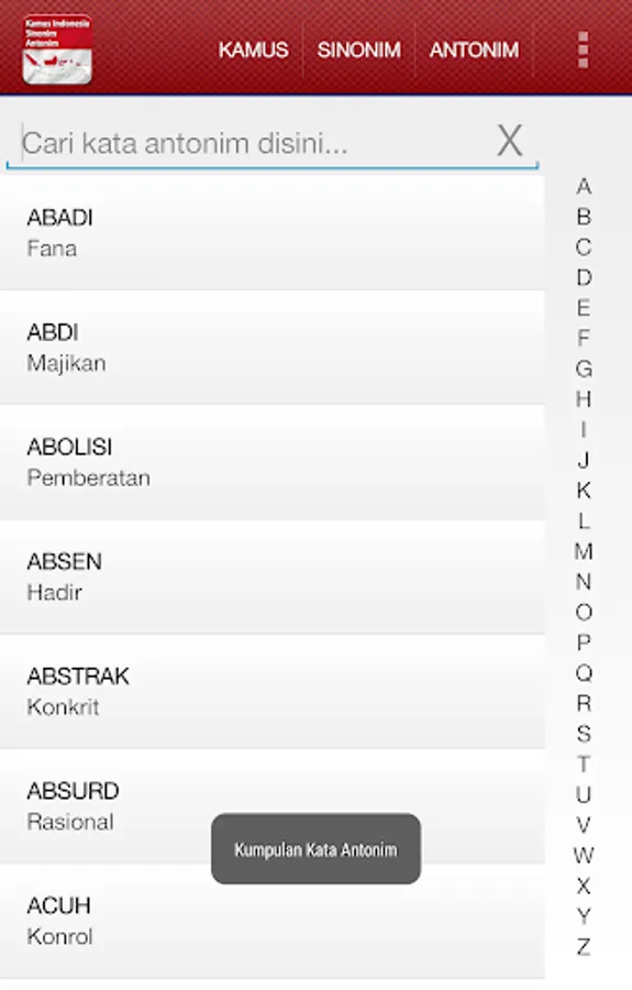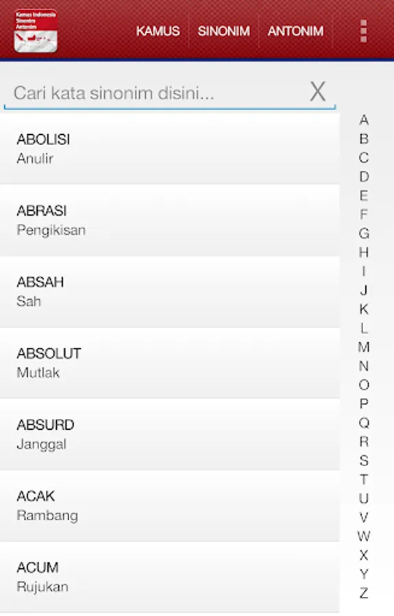 This application comes with a collection of Synonym and Antonym Indonesia words .