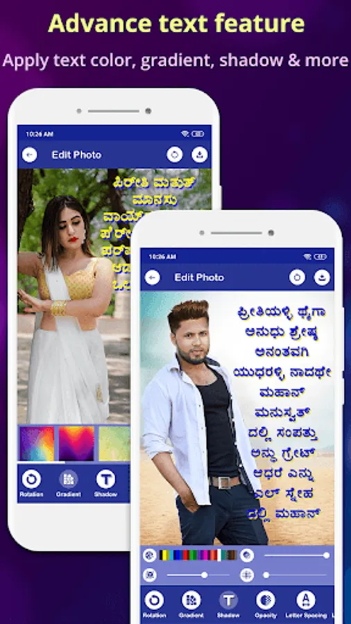 You can Write Kannada Shayari, Your Name on photo in Kannada, Kannada Poetry, Kannada Suvichar, Kannada Gazal, Kannada Jokes, Kannada Poem and Messages easily with the help of Kannada keyboard on your selected photo from gallery or camera.