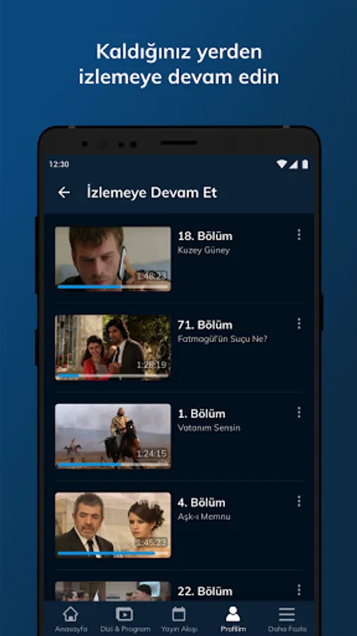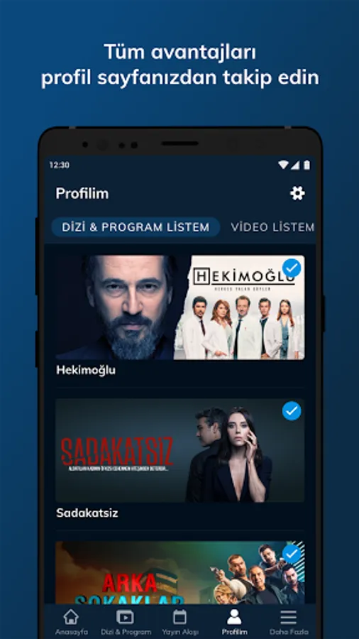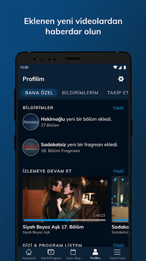Uygulamada geçirdiğiniz zamanla ve tercihlerinizle size özel oluşan profil sayfasında, izlemeyi daha sonraya bıraktıklarınız, prestij rozetleriniz, yeni eklenen bölüm, fragman ve özel içerikleriniz için hızlı erişim ve diğer tüm üyelik avantajları elinizin altında.