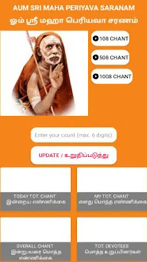 Aum Sri Maha Periyava Saranam App provides devotees a provision to update their Chant count everyday and allows them to listen to Chant