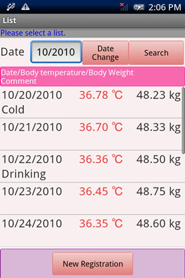 List of basal body temperature can be searched.In addition, new registration and correction are possible.(Body temperature inputs with "3654". It is displayed with "36.54".)