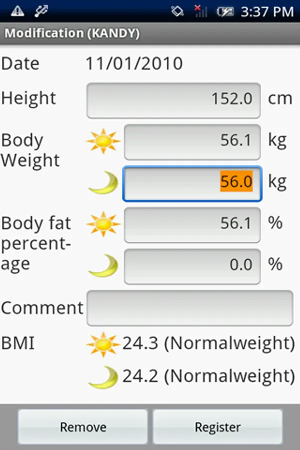 Body height inputs with "1234". It is displayed with "123.4".Body weight inputs with "123". It is displayed with "12.3".
