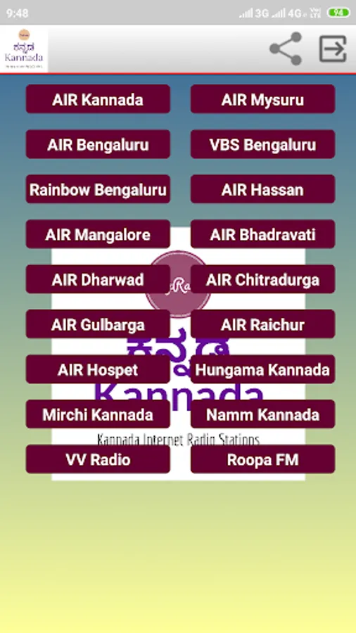 AIR Kannada, AIR Bengaluru, Rainbow Kannada, AIR Hassan, AIR Dharwad, AIR Mysuru, AIR Bhadravati, VividhBharati Bengaluru, AIR Chitradurga, AIR Gulbarga, AIR Raichur, Air Mangalore and so may.