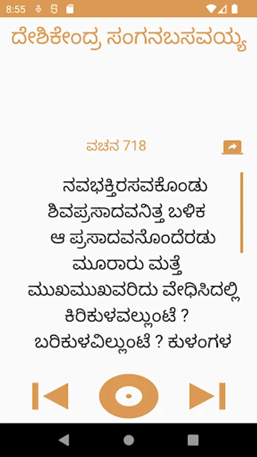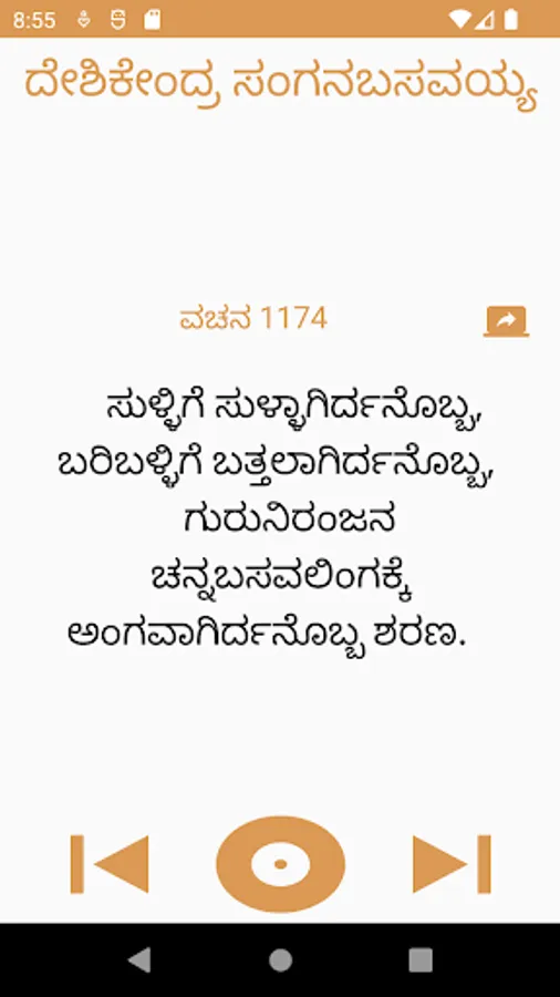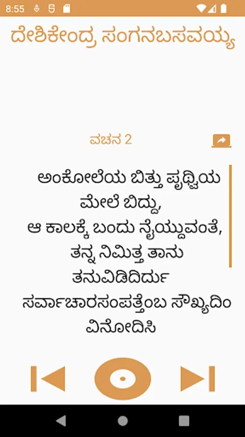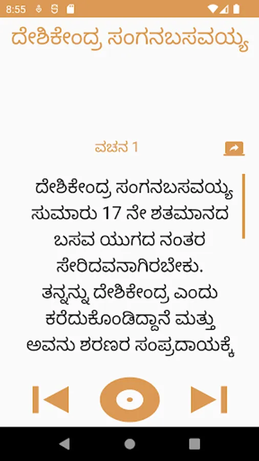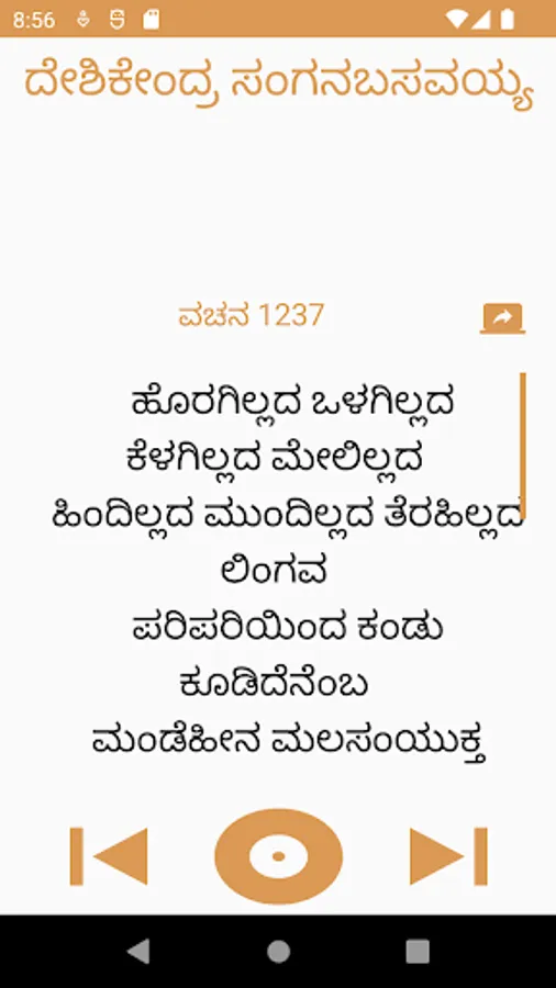 Desikendra Sanganabasavayya must belong to about 17th century after the Basava era. Called himself Desikendra and must have belonged to the Sharan tradition. Since it is called 'Deshikendra', it must be Charjangam belonging to Virakta Parampara. They may have come from a place called Karajige near Solapur. Ankita of Guruniranjan Chennabasavalinga. 1242 verses of his have been found. They have been compiled under the heading 'Shut Sthala Vachanas'.