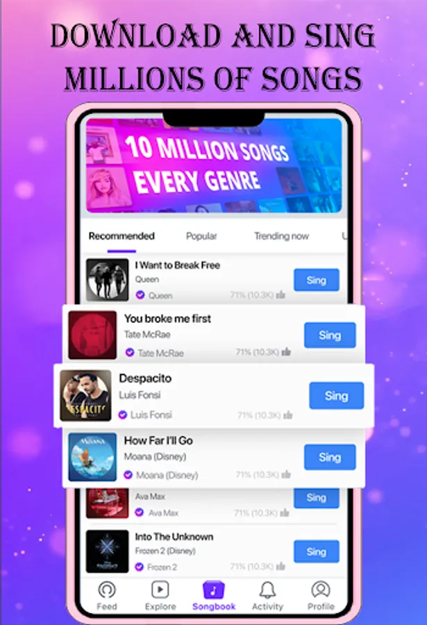 Sing a cappella, solo, duet, or with a group of friends or other singers. Share your voice, and dance along to hit songs. Use audio effects and video filters to look and sound your best while you make a music video to your favorite karaoke songs. You can even give live performances using the Sing Live feature!