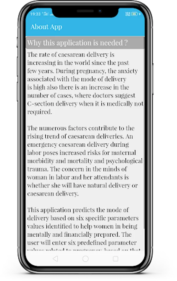Disclaimer: App predicts the type of delivery based on Naive Bayes algorithm. Result predicted by the app is the probability of the type of delivery, and it cannot be considered as the final prediction.