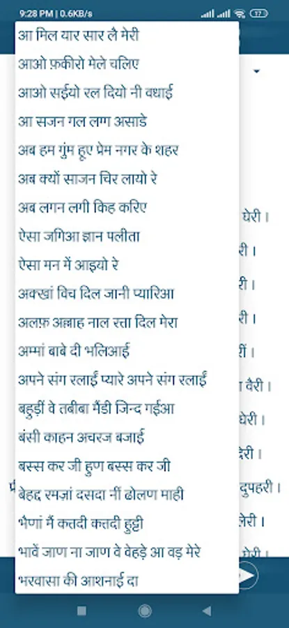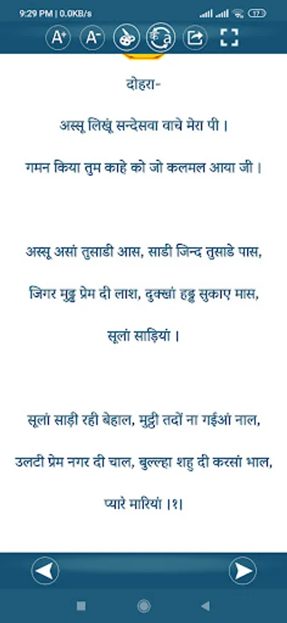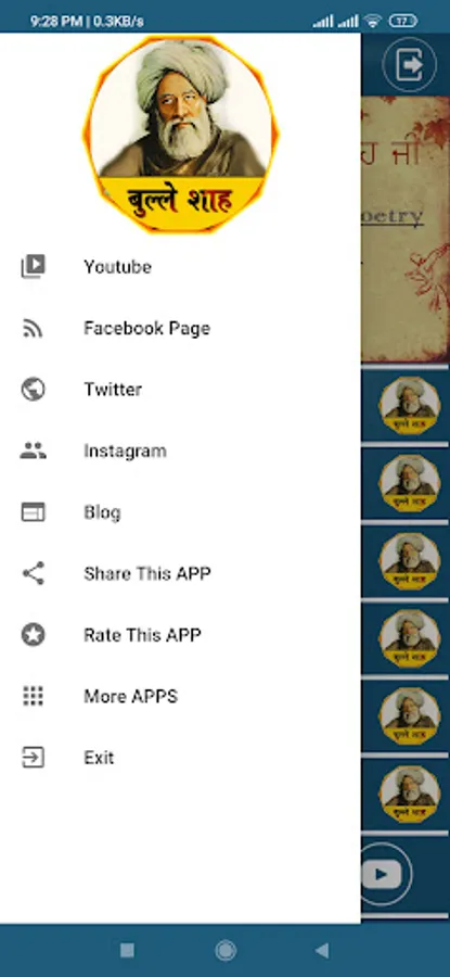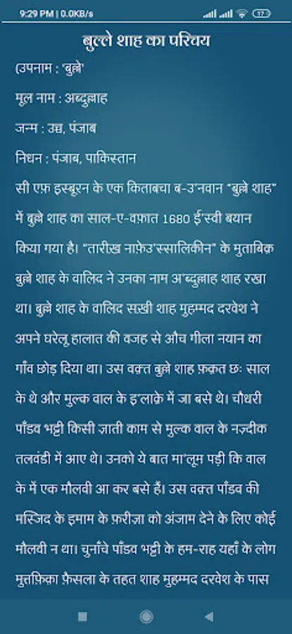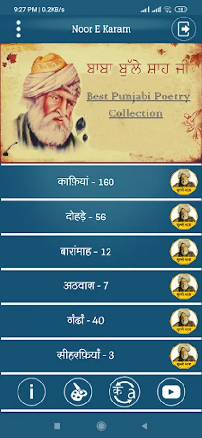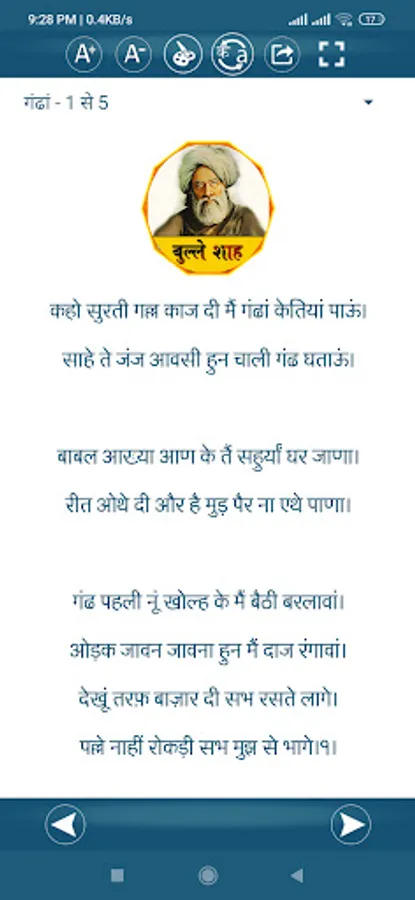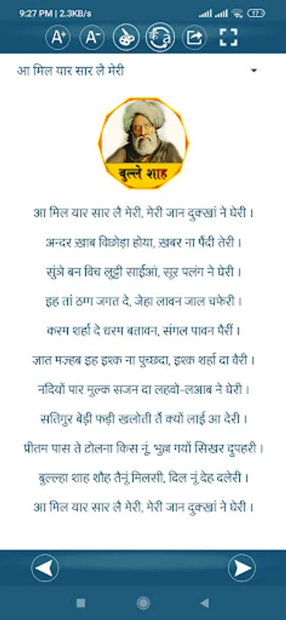 This app contains poetry of Baba Bulleh Shah . Bulleh Shah has written famous compositions like Kafian, Dohre , Barahmah, Athwara, Gandan and Sehrifian. Baba Bullah Shah has shown extreme bravery and secularism while writing against the religious bigotry and tyranny of the rulers of his times.