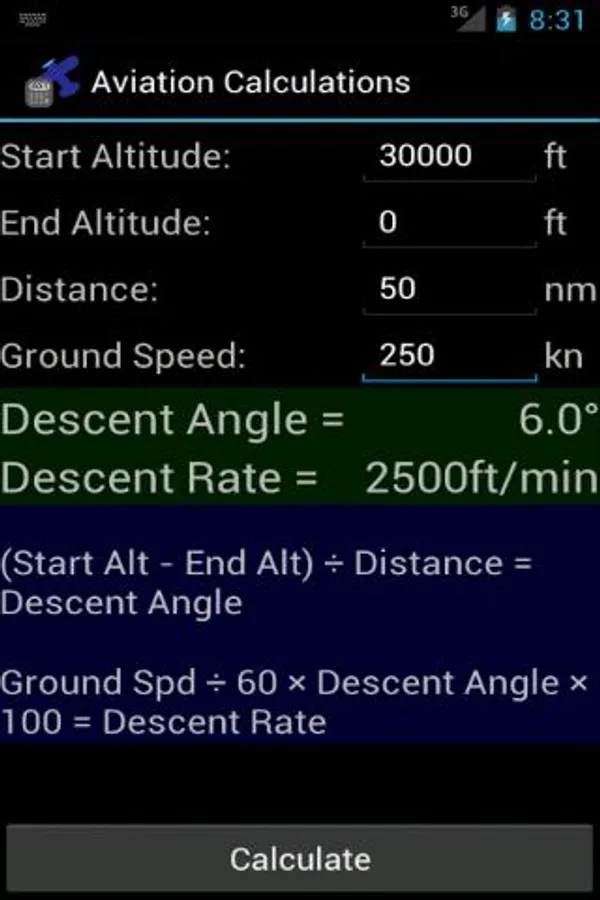 Includes equations for determining descent angle and VVI, crosswind calculations, drift correction, and visual descent point. Good for student pilots who want to practice 60:1 rule applications.