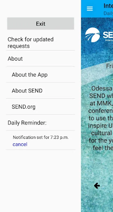 Scroll through the daily prayer requests for the current month. Set a daily notification to pray daily for SEND International personnel and projects.