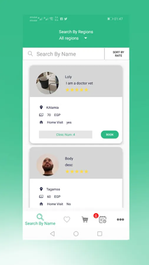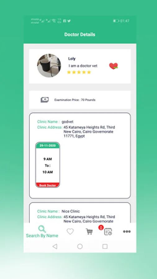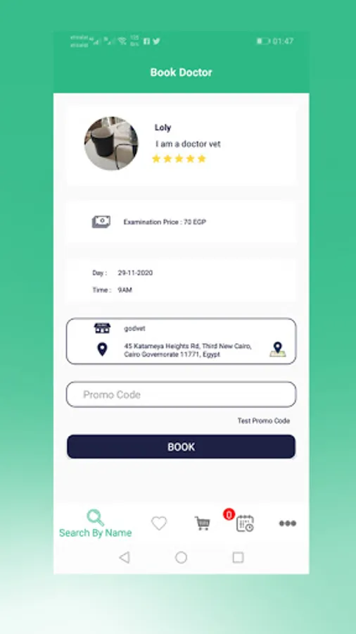 يمكنك من خلال التطبيق الحجز في عياده بيطريه مجانا و معرفه موعد و عنوان العياده كما يمكمك طلب الطبيب في زياره منزليه خاصه الي منزلك و اختيار الطبيب بنائا عن تقيمات حقيقه من مستخدمين