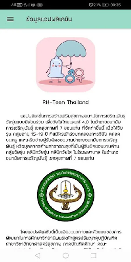 Applications to promote reproductive health in adolescent adolescents For youth in Thailand 4.0 in the Reproductive Health District of Health Region 7, Khon Kaen. This application is only a guideline and a model of development in the study of the Doctor of Philosophy course. Health Science Program Graduate Faculty of Medicine Mahasarakrm university