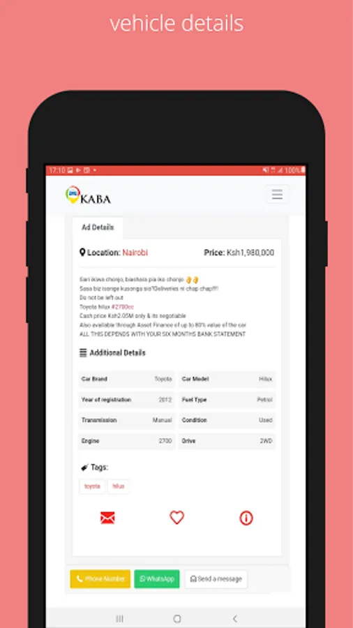 If you have any doubts, problems or suggestions, please do write us an email at info@kaba.co.ke and we will do our best to fix whatever is bothering you. If you enjoy Kaba Motors, please leave us a review on Google Play!