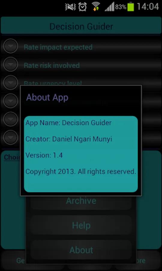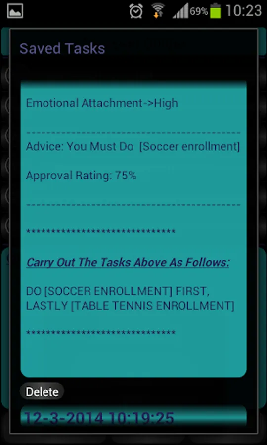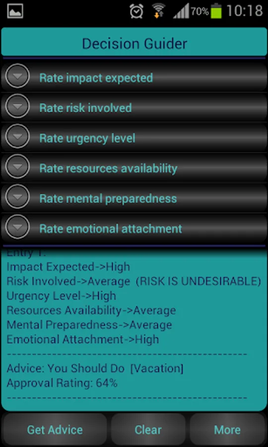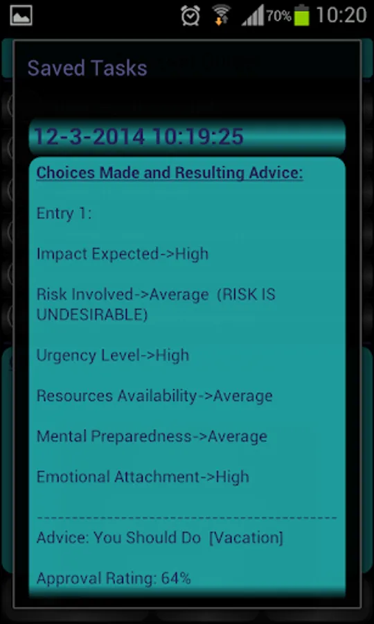 Think of any task of interest to you, use this application to rate the 6 components, and you will get an advice whose conviction (must, may, should), is drawn from the computed rating. When considering multiple tasks, make their entries in succession, and this application will also compute a prioritized list at the bottom. You can save, set a reminder for, PERSONALIZE and delete task information.