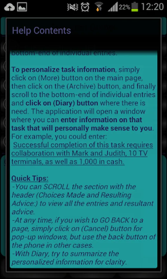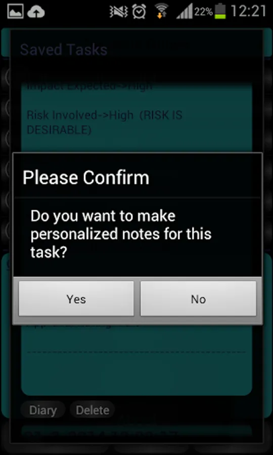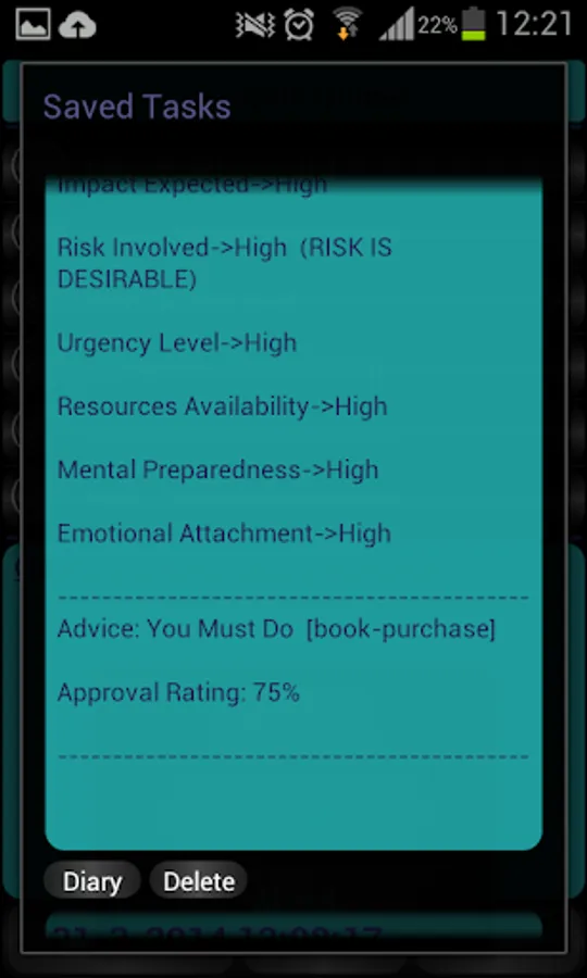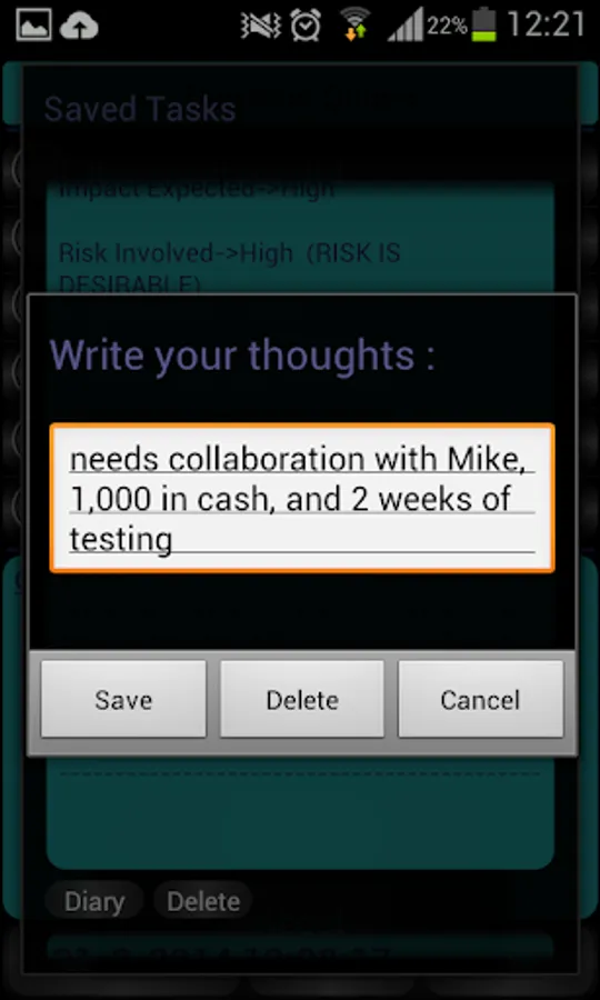 You will now notice a button labelled Diary before the Delete button. Click on Diary button and you can type in anything you deem valuable for the saved task. This way, you combine your thoughts with the technical guidance by the app. (Check out screenshots 4 to 7 for a glimpse)