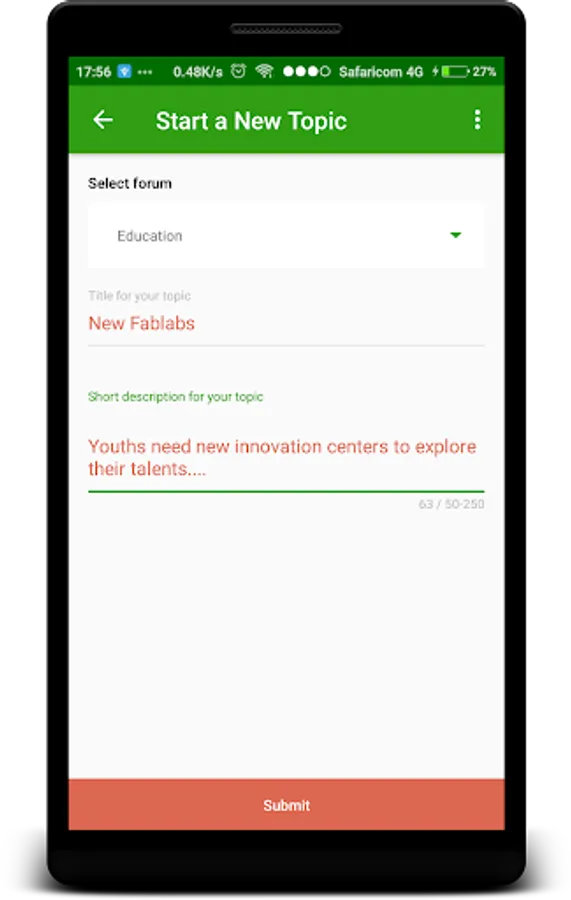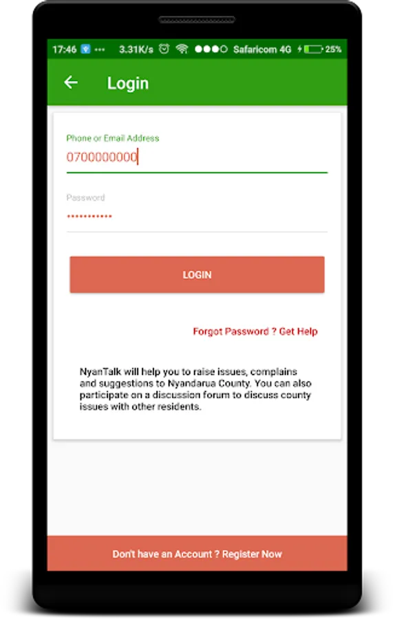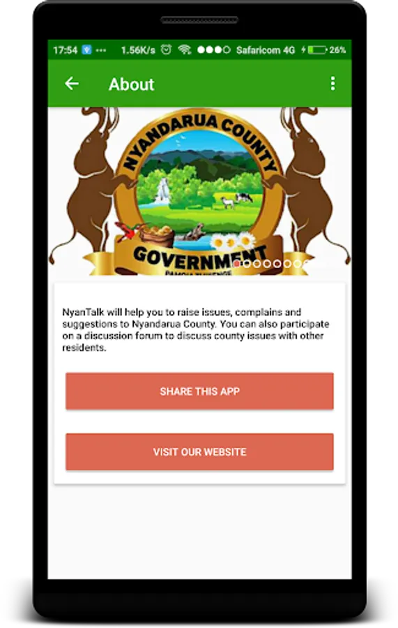 NyanTalk App will help you to raise issues, complains and suggestions to Nyandarua County.You can also participate on a discussion forum to discuss county issues with other residents.