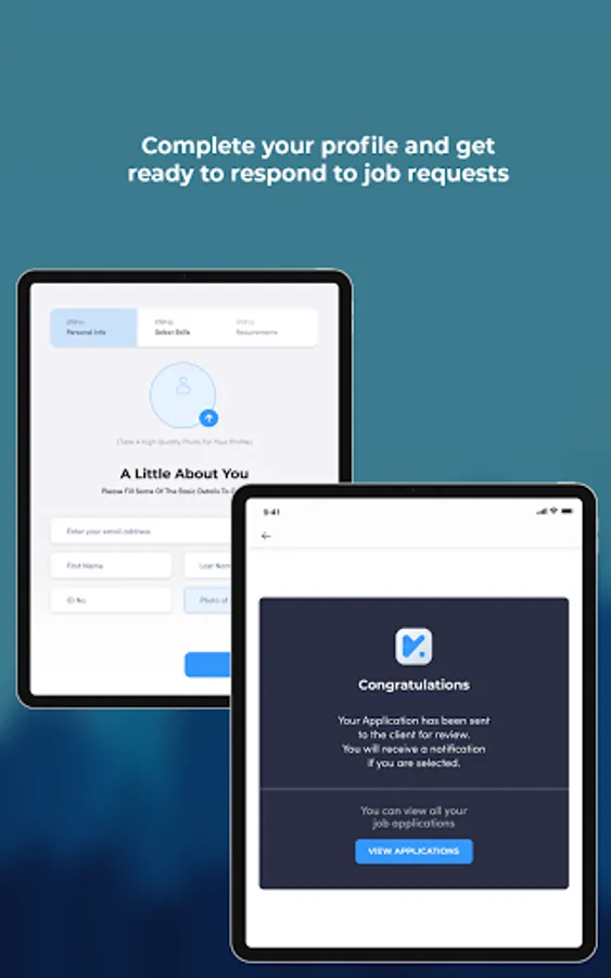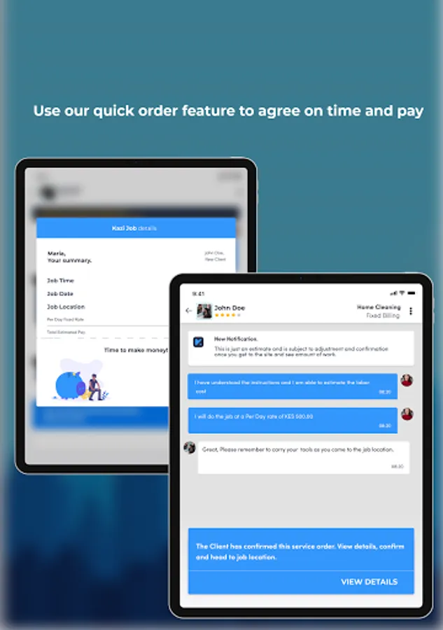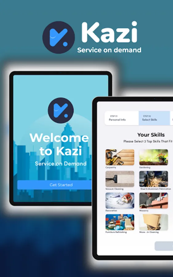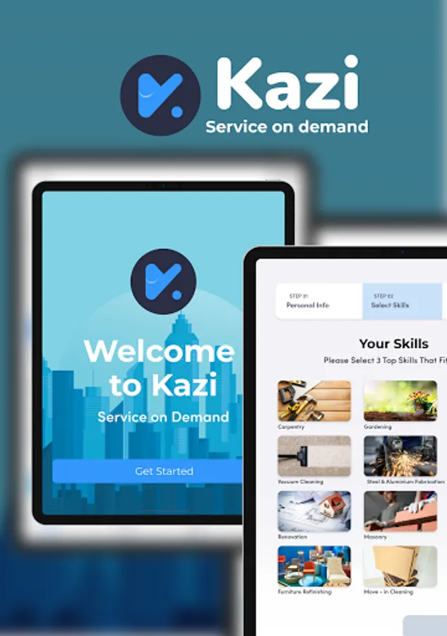 The Kazi platform works through two secure mobile phone applications, the Kazi Worker app and the Kazi - Request a Service app for clients. The two apps work together in real time.