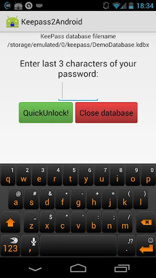 Is this safe? First: it allows you to use a really strong password, this increases safety in case someone gets your database file. Second: If you loose your phone and someone tries to open the password database, the attacker has exactly one chance to make use of QuickUnlock. When using 3 characters and assuming 70 characters in the set of possible characters, the attacker has a 0.0003% chance of opening the file. If this sounds still too much for you, choose 4 or more characters in the settings.