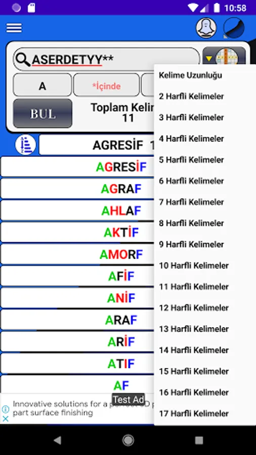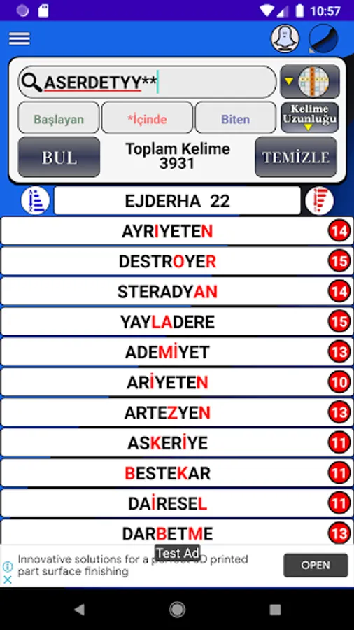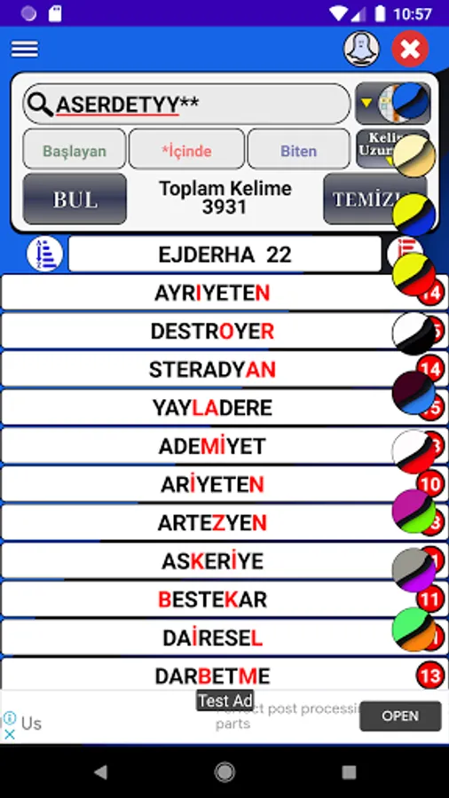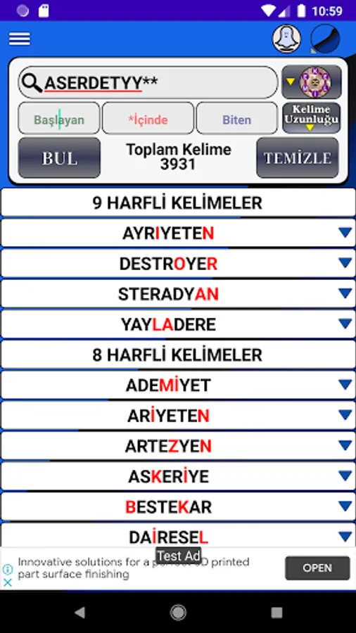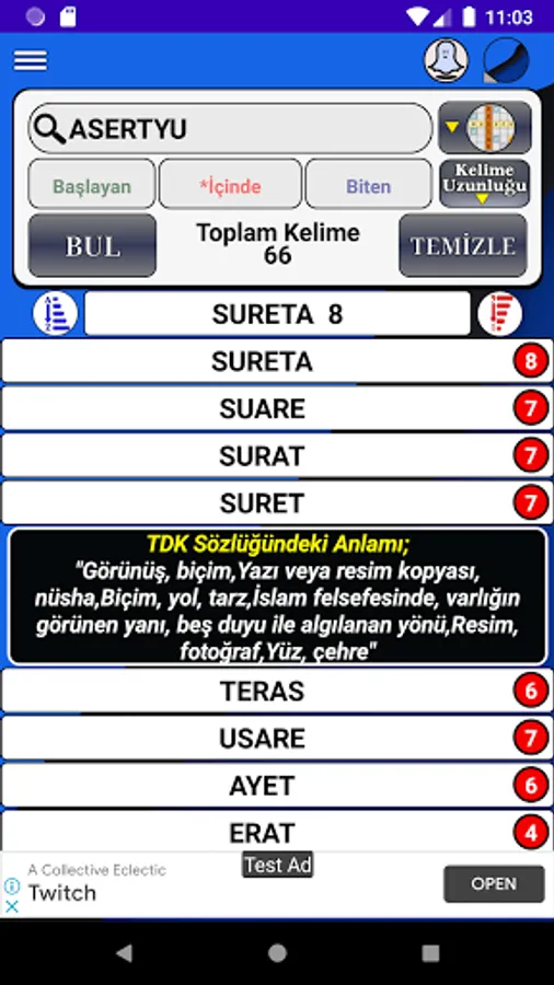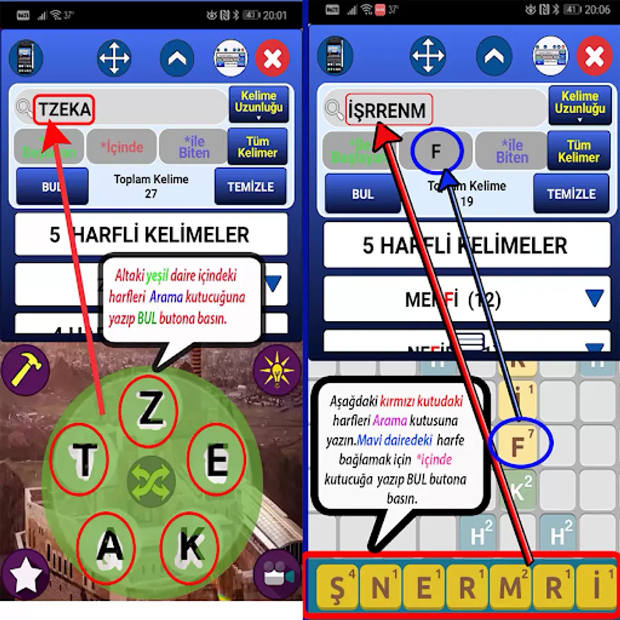 Application; It quickly lists all words consisting of combinations and anagrams of the entered letters, together with their meanings in the TDK Dictionary.