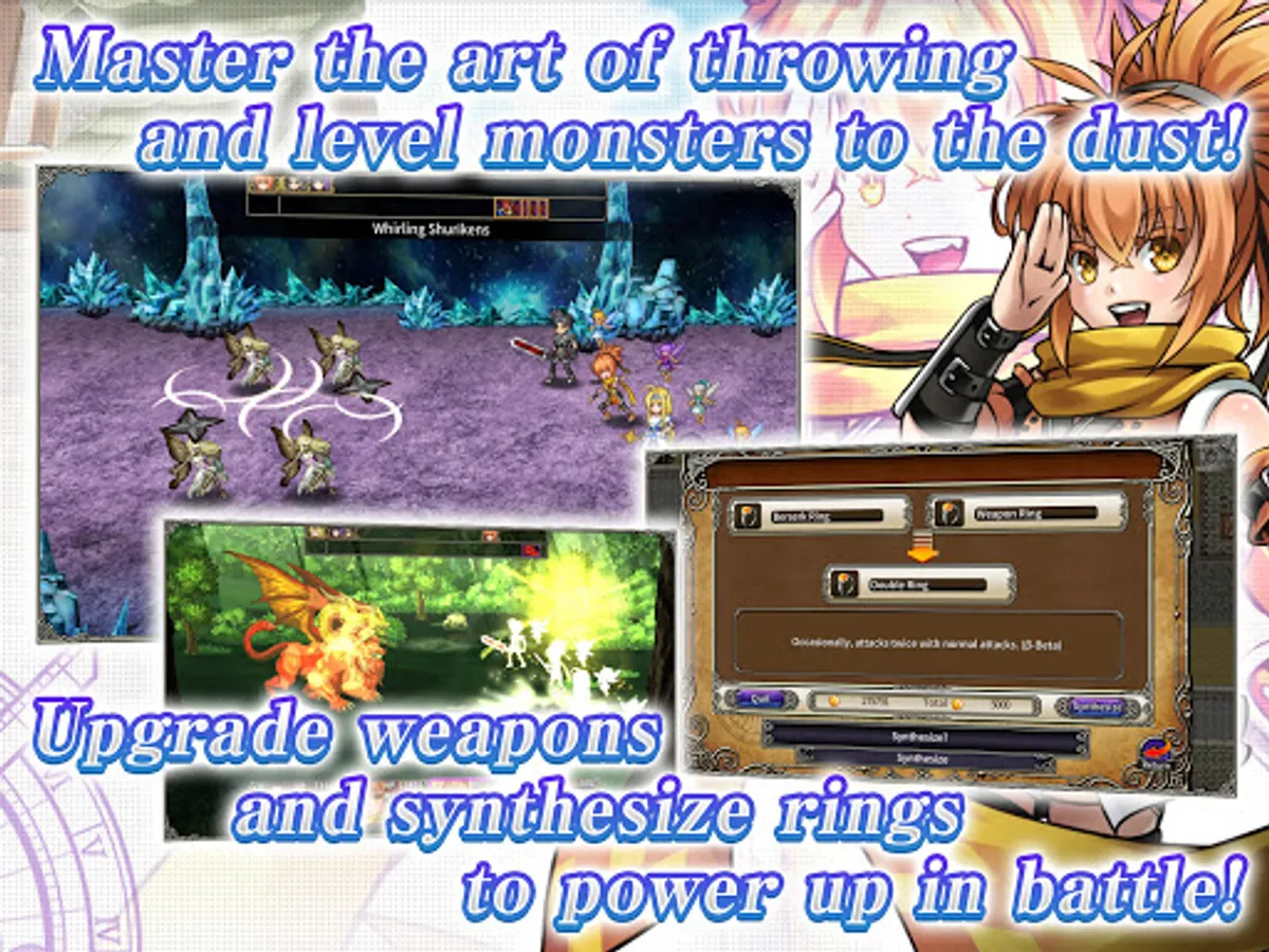 Master the art of throwing and level monsters to the dust! Get powerful support from spirits that can be equipped to enhance magic, and upgrade weapons and synthesize rings to power up in battle. You can even get special endings by building up trust with other characters, and take on the strongest at the battle arena to enjoy this fantasy RPG in its entirety.