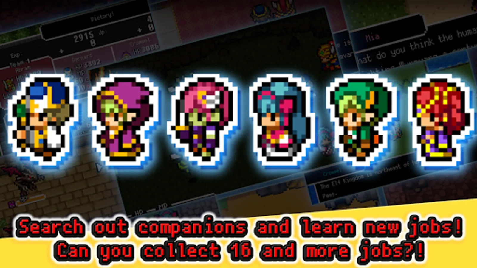 Scour the world in search of new companions and collect more than 16 jobs! Then by mastering the skills particular to each job, battles will play out in increasingly strategic and exciting ways! And if that were not exciting enough, character costumes also change according to their job, giving pixel lovers something even more to look forward to!