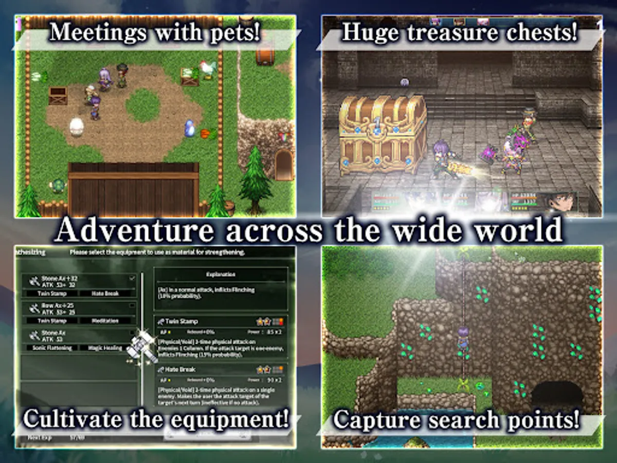 Throw yourself into the beautiful, complex turn-based battles, using magic swords with up to three weapons set! The overwhelming charm of pixelated graphics surround your entire world and adventure in a unique fantasy JRPG. Not to mention all the necessary elements from treasure hunting, quests, pet buddies to almost-infinite level caps!