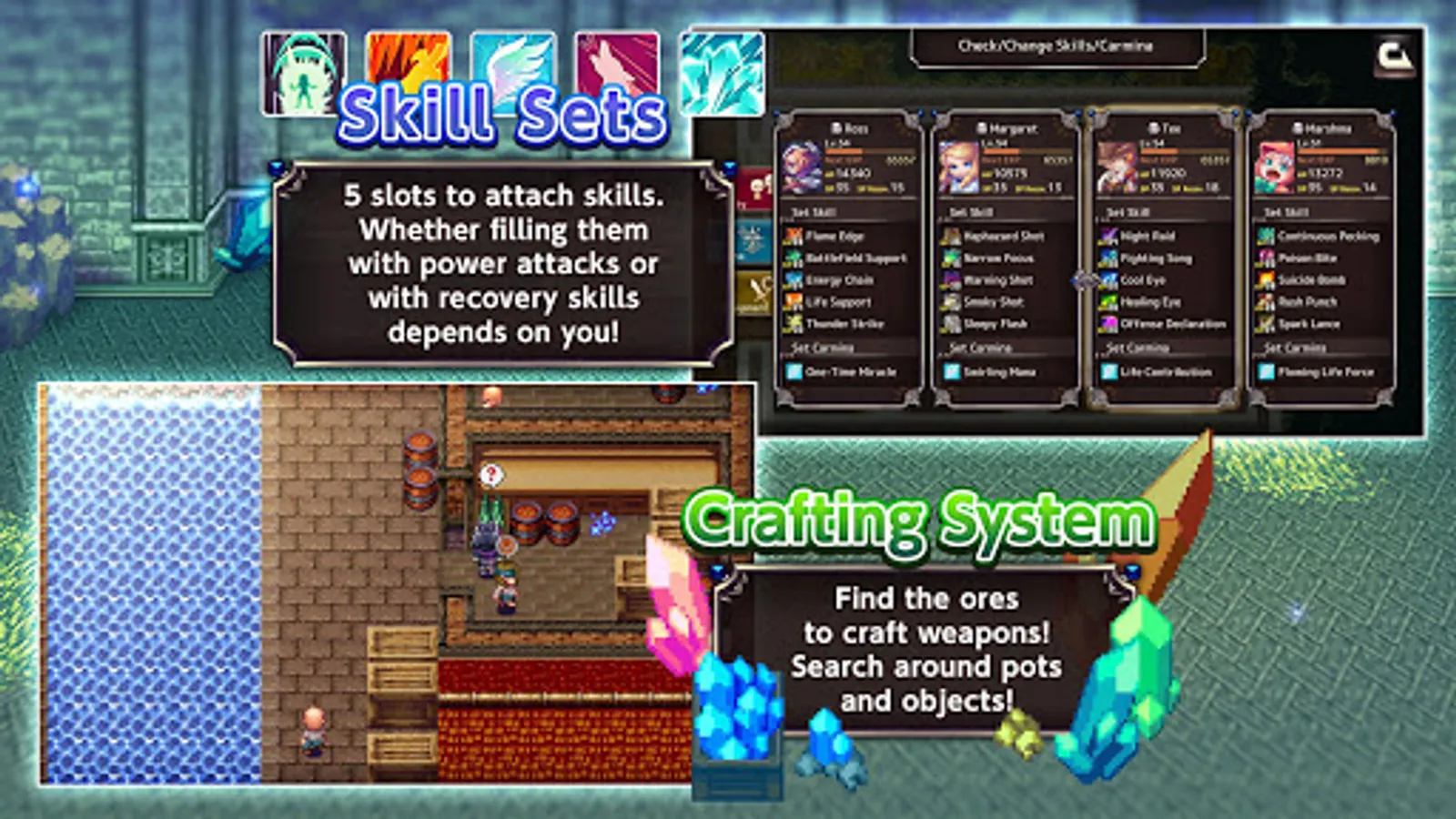 Enjoy solving puzzles in dungeons, and strike up conversations with the people around the world. Battles with bosses feature conversations, which might even give you some hints about tactics! Fill the skill slots with the skills you like to be prepared for strategic turn-based battles.