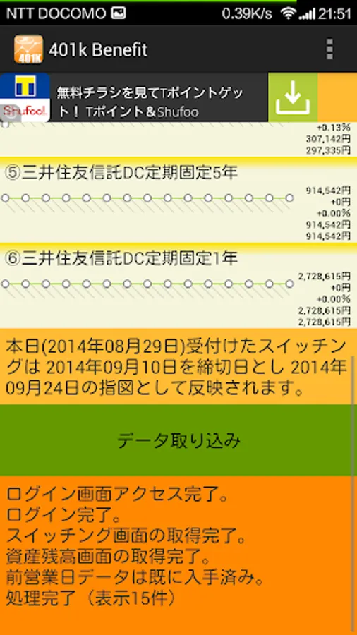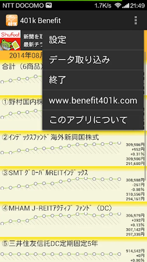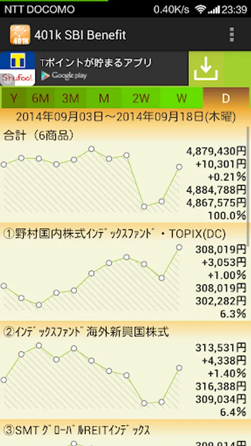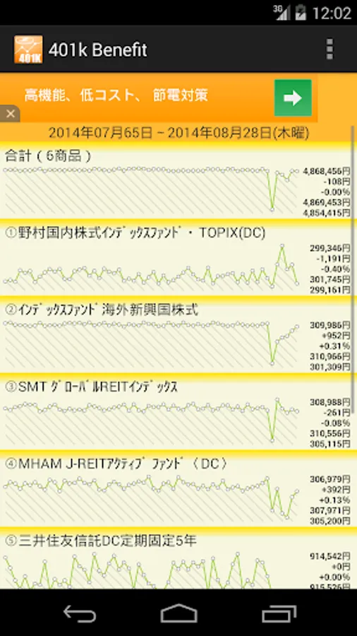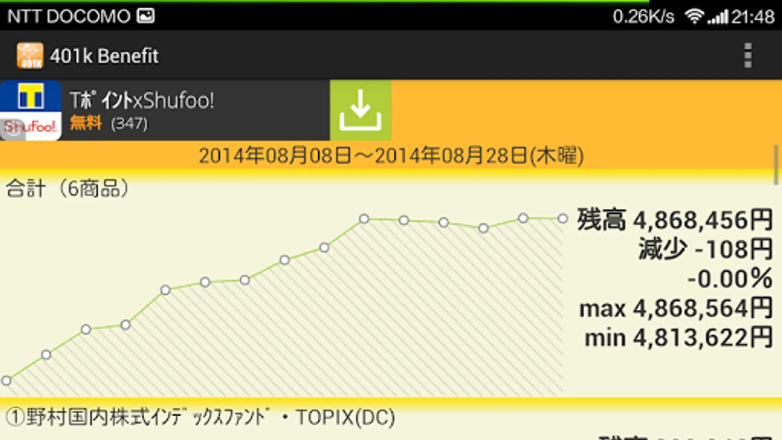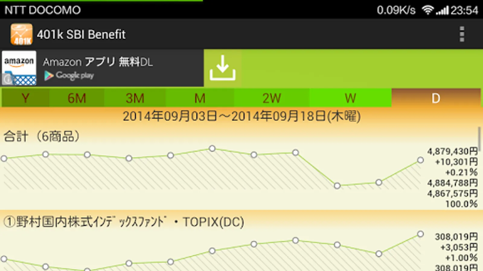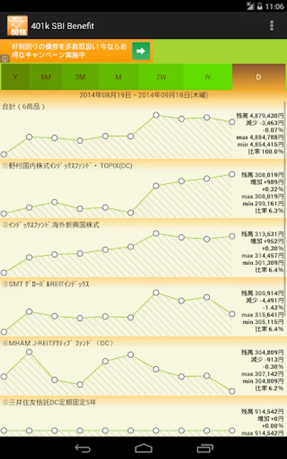 We accumulate the latest balance for each product of your 401K / iDeCo with one touch every day and display the balance change graphs in a list. Display daily, weekly, 2 weekly, monthly, 3 monthly, 6 monthly, and yearly graphs. A list of transaction history can also be displayed. (Subject management company: SBI Benefit Systems Corporation only)