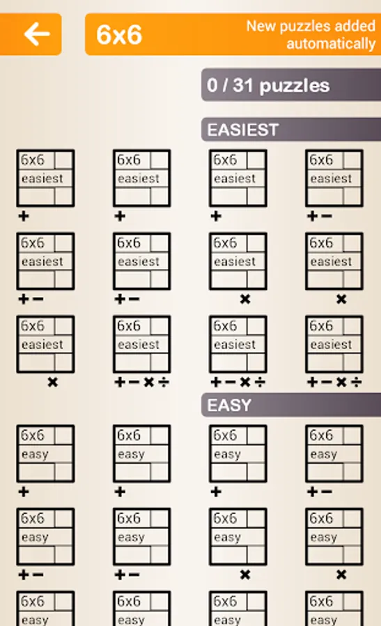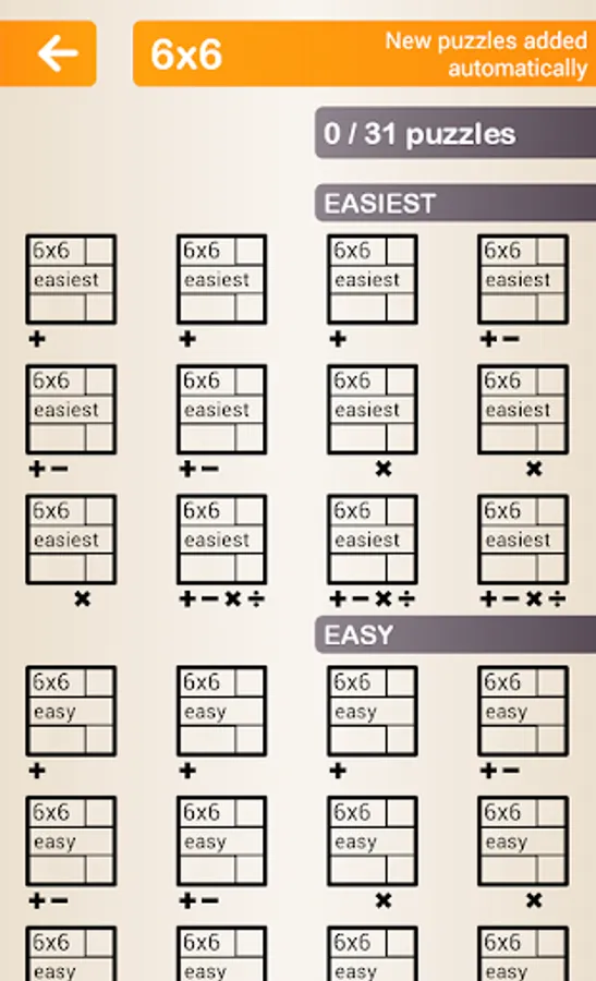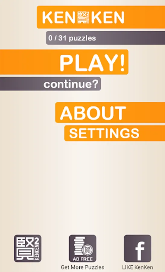 There are virtually unlimited KenKen puzzles available to you on this app. The first 50 are included FREE with the download. If you need more...no problem! Just order them and they'll appear immediately. YOU select the size, difficulty level, and operations. After you complete a puzzle, a new puzzle of the same type will automatically load so you can continue to challenge yourself.