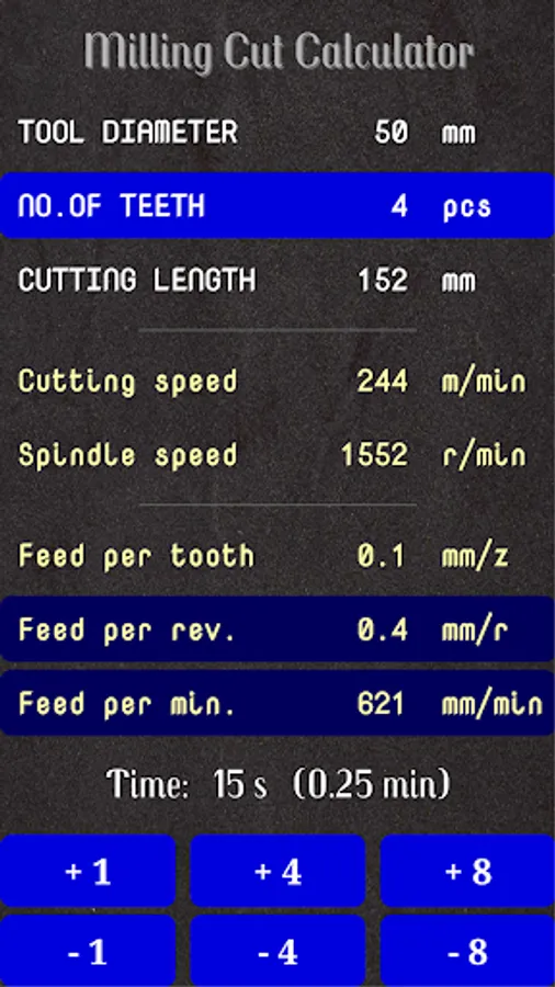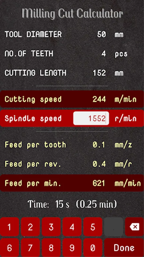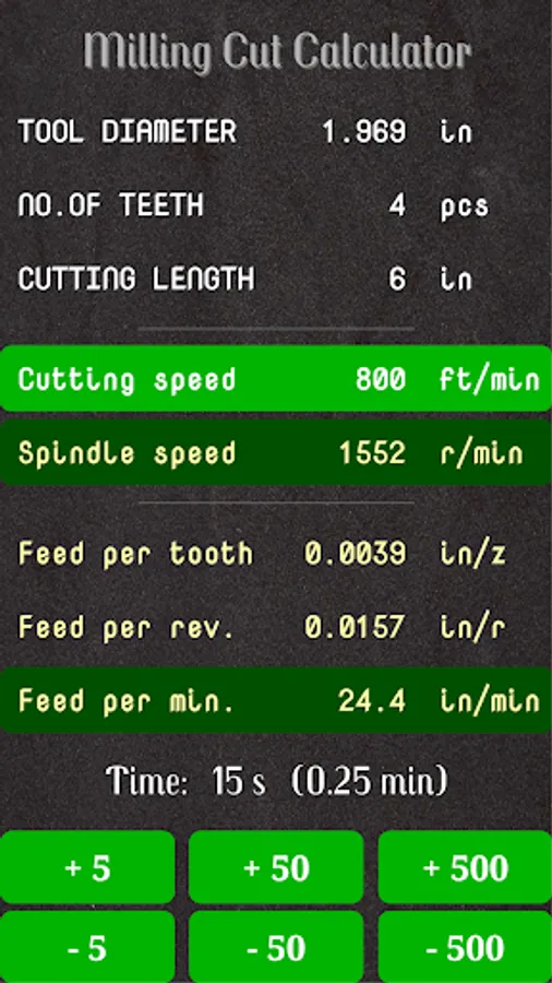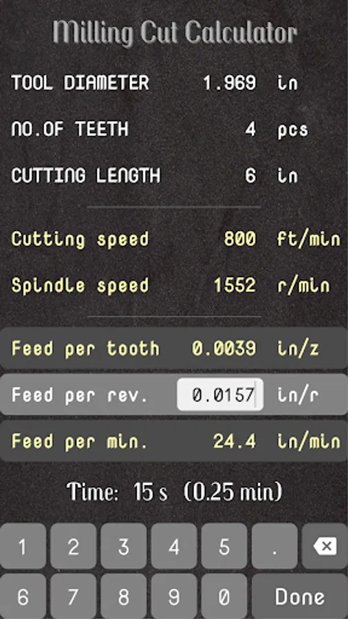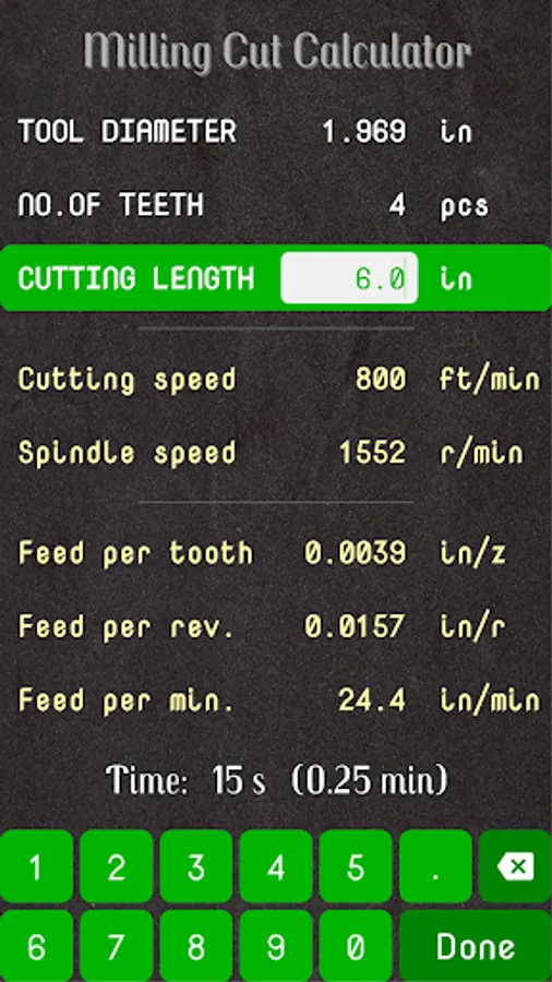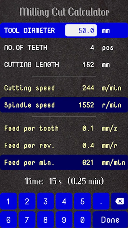 - Calculates the time for a milling cut by using given milling data