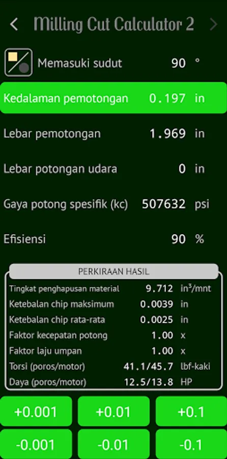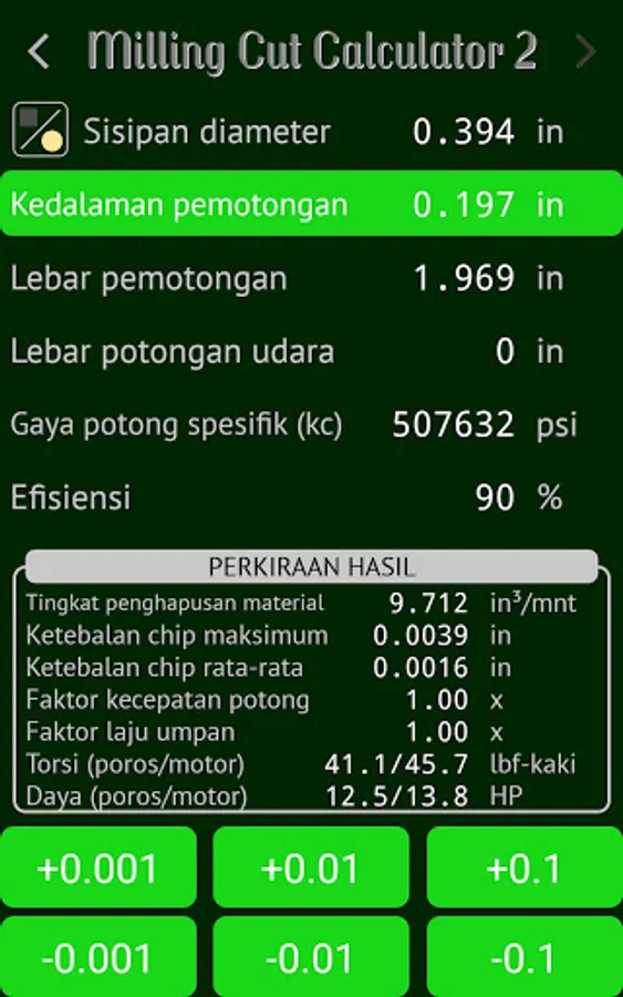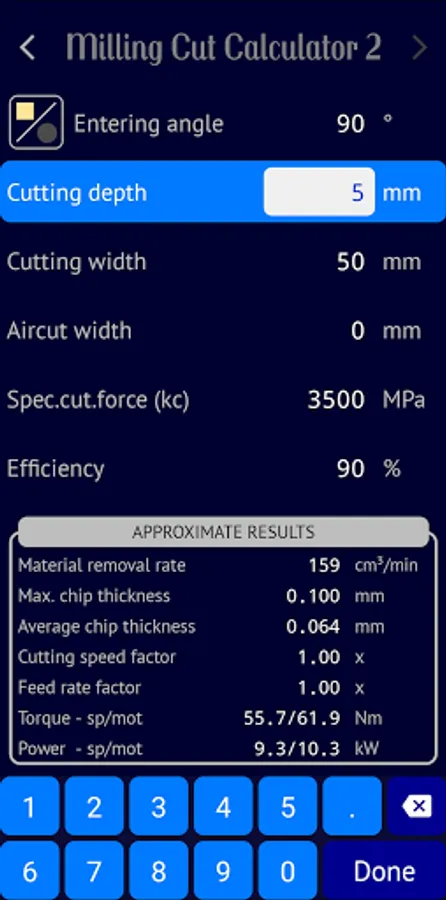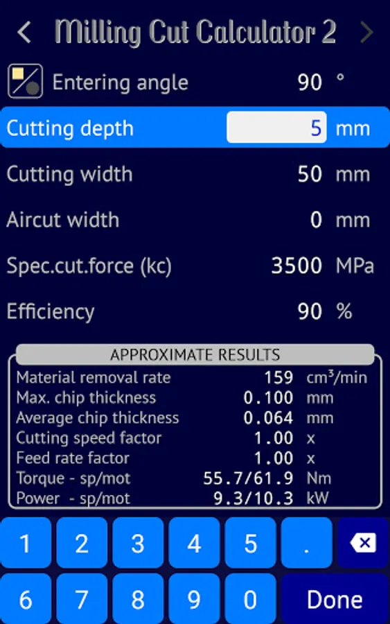 - Calculation of the input data also gives results for material removal rate, chip thicknesses, cutting data factors, torque and power