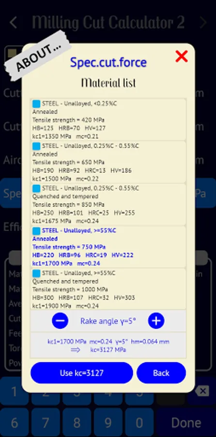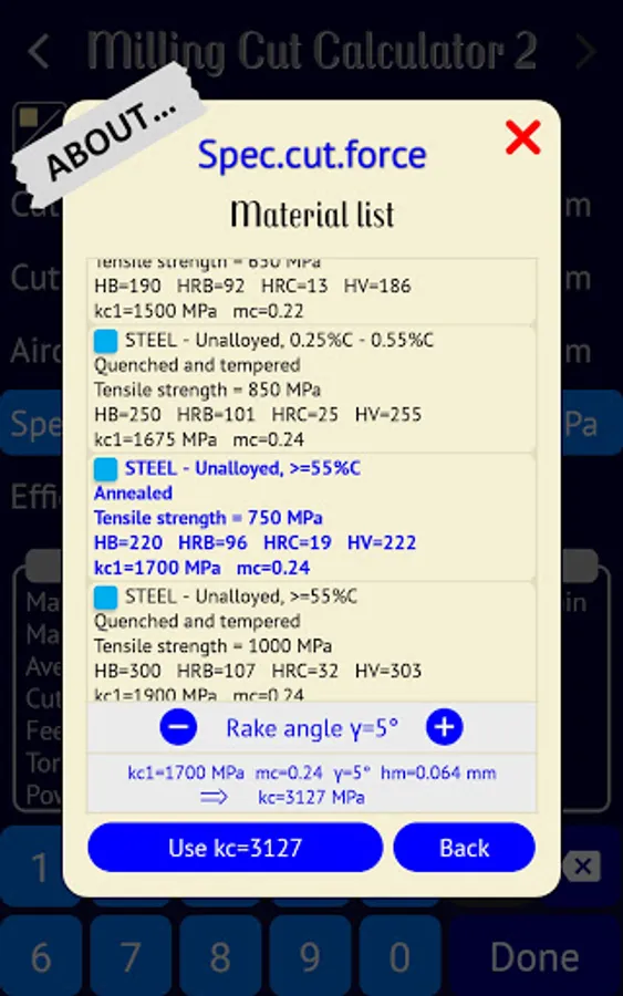 - Calculates a reasonably correct specific cutting force from selected material, tool rake angle, and average chip thickness