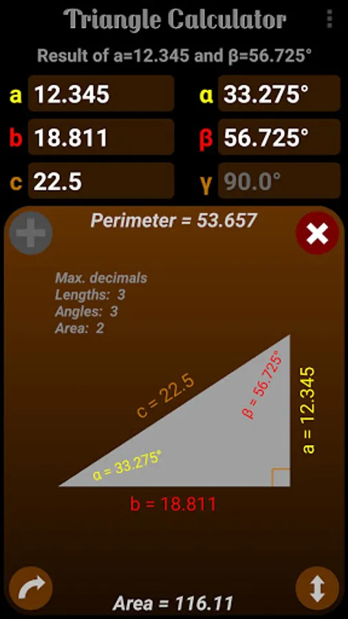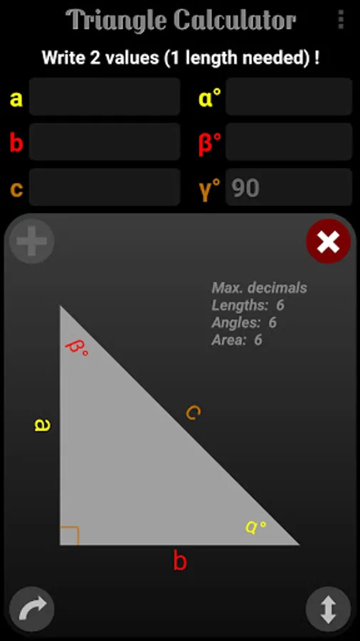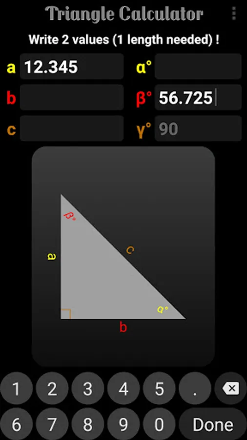 By trigonometry, lengths and angles are calculated for a right angled triangle when only two values are known (at least one must be a length). The triangle's area and perimeter are also calculated.
