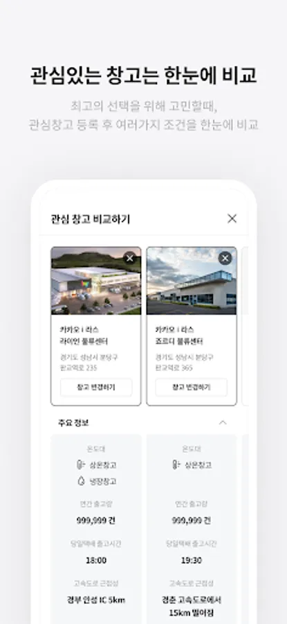 - Compare warehouses of interest at a glance and select the optimal distribution center
