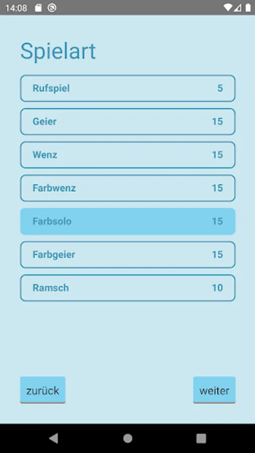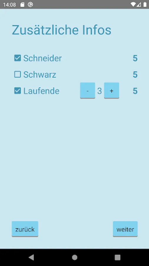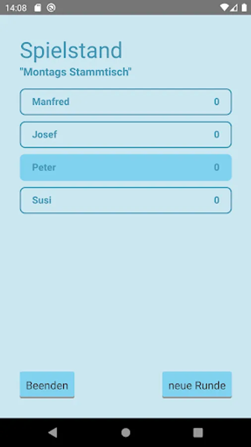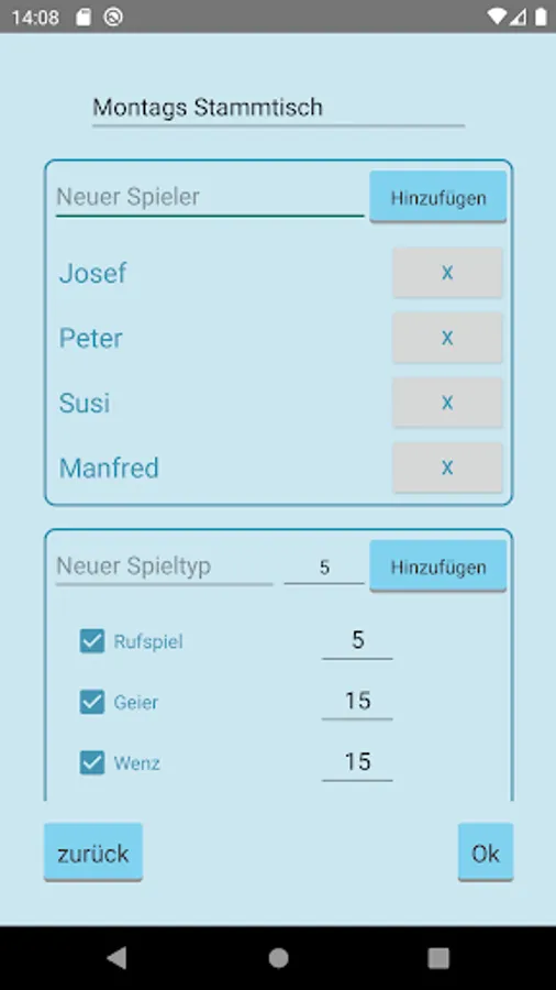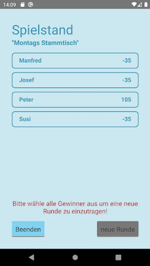 - Add played rounds with selection of winners, game type and extras (tailor, black ...)