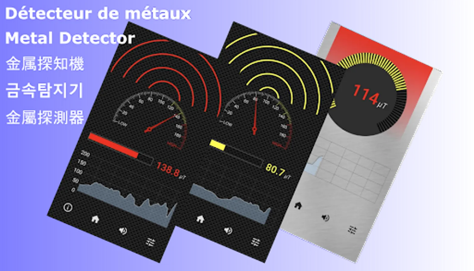 For your taste and convenience, this app offers three types of metal detectors. You can choose one of three metal detectors from the main menu.
