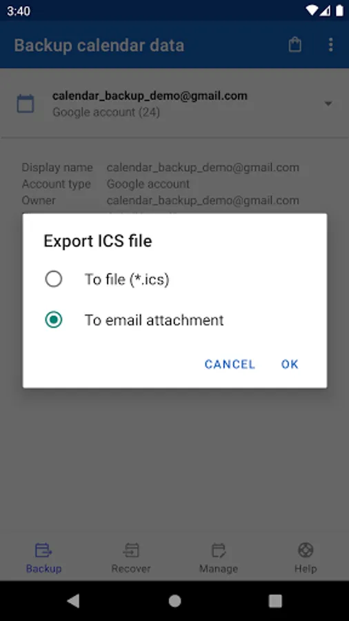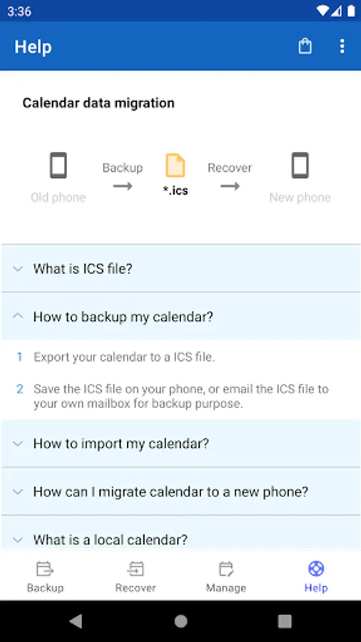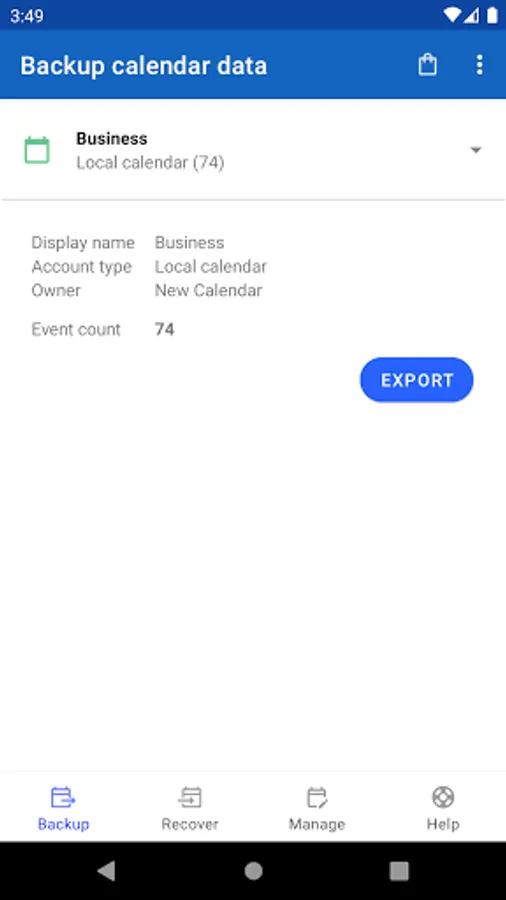 This tool help you to backup and restore your calendar entries. It can export you calendar entries as ICS / iCal file. This file format is widely used in many different calendar applications, so that you can import the file from this app, or other calendar applications.