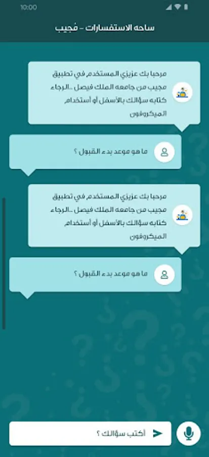 "Mujib" is an artificial intelligence application designed for smart simulation of human conversations by hearing and writing to answer queries and questions of students of the program developed for enrollment education at King Faisal University about the completion of university transactions, from registration, processing errors, applications, various services, request documents and payment problems , And other services.